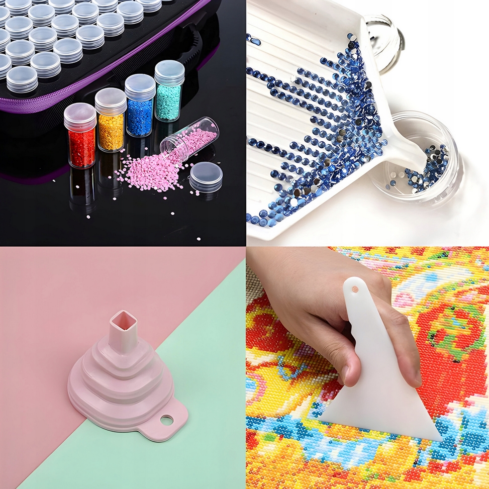W zestawie znajdują się narzędzia do tworzenia unikalnych dzieł sztuki za pomocą techniki malowania diamentowego.
