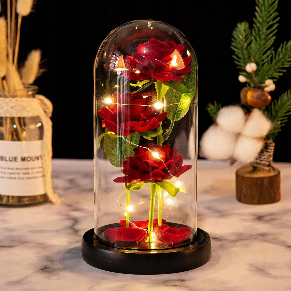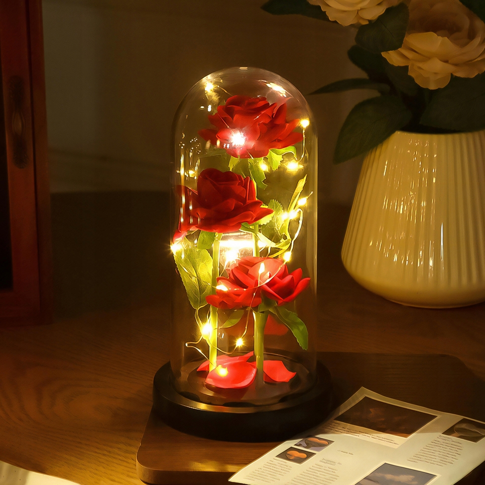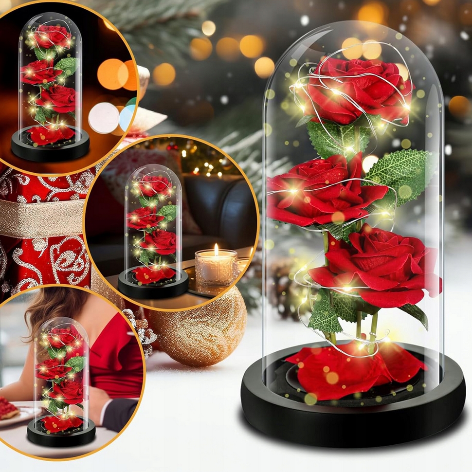 Napisz pierwszą opinię o „AMORE MIO Wieczna róża ozdoba świecąca led prezent szklana kopuła 3 róże 22cm”