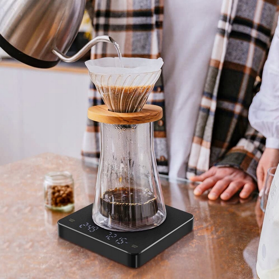 Waga wyposażona została w 2 przyciski dotykowe, co usprawni proces ważenia, parzenia kawy, czy innych czynności związanych z ważeniem.