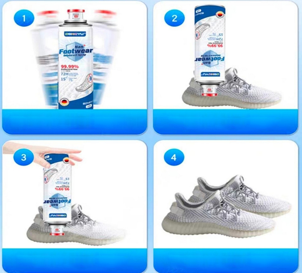 Aplikacja polega na wstrząśnięciu opakowania i lekkim spryskaniu wnętrza buta.