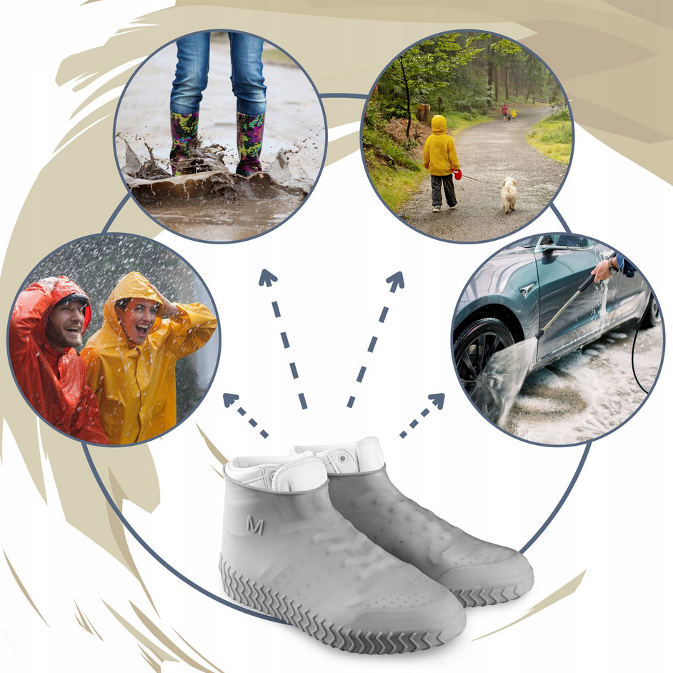 Wodoodporne ochraniacze na buty wykonane są z wysokiej jakości elastycznego, nieprzemakalnego materiału, który skutecznie chroni obuwie przed deszczem, błotem i zabrudzeniami.