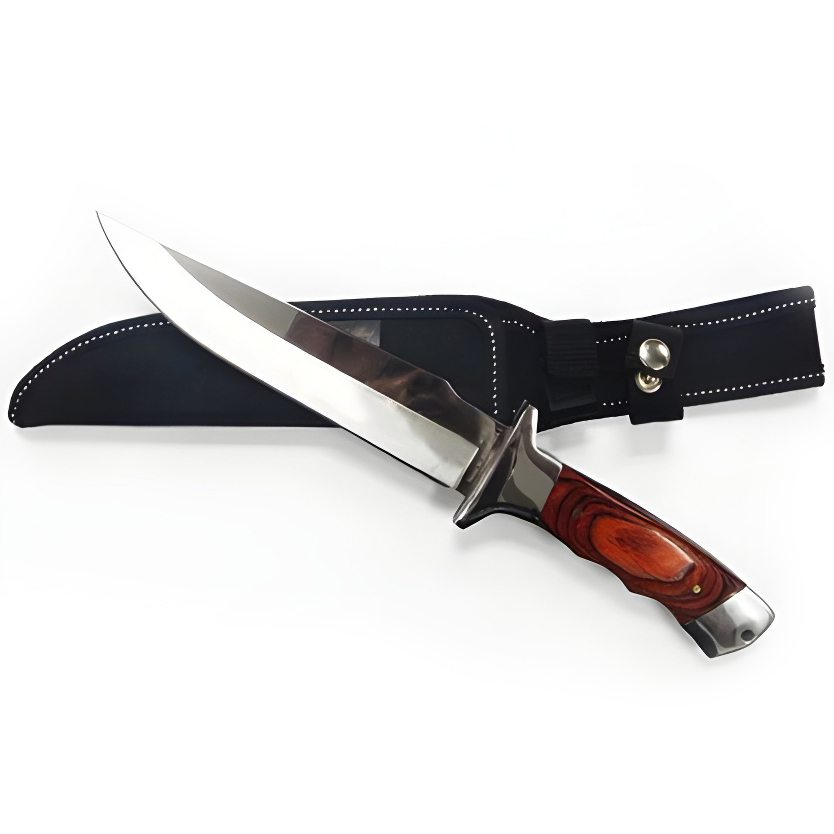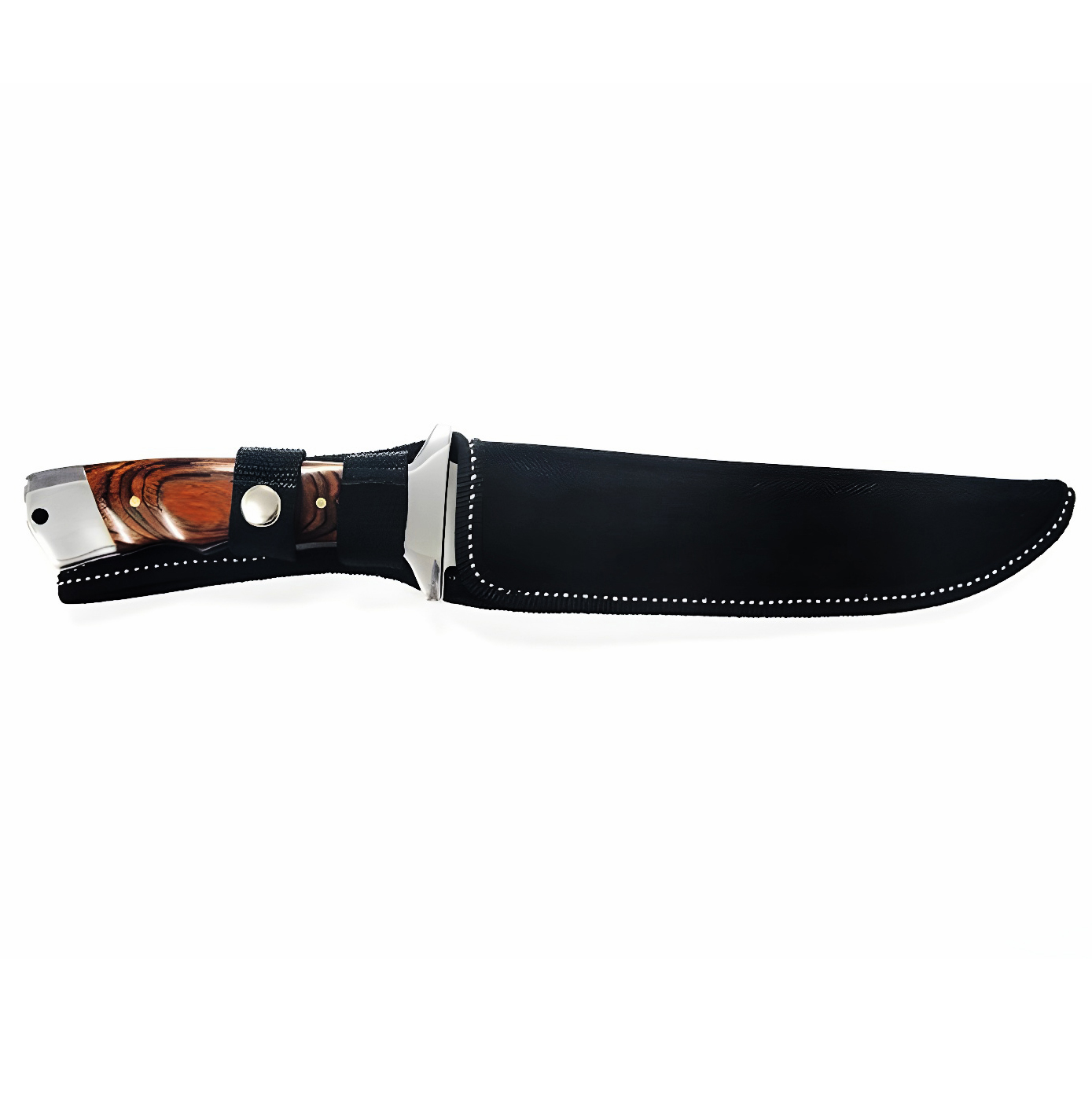 Nóż myśliwski posiada czarny pokrowiec, który można przymocować do paska lub plecaka.