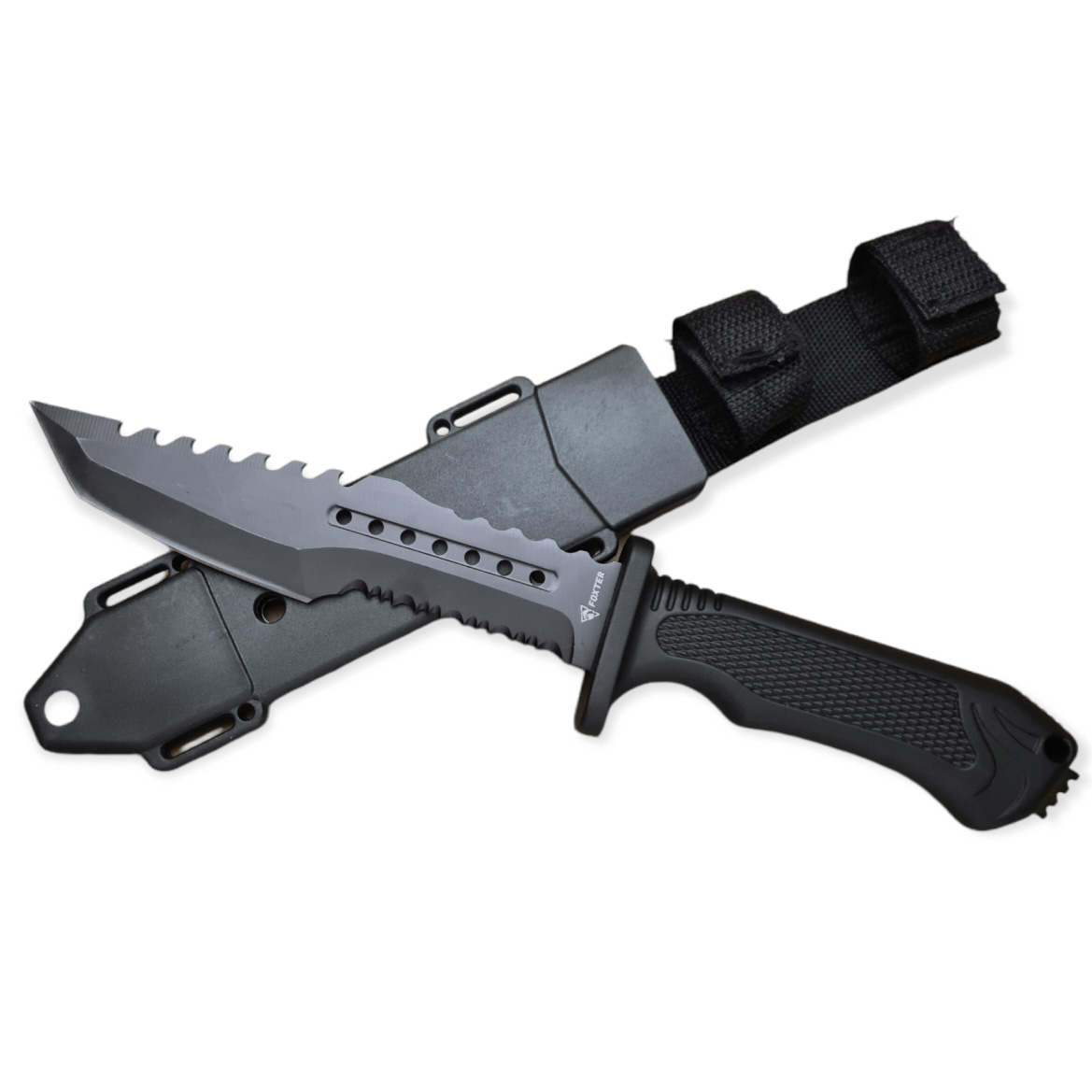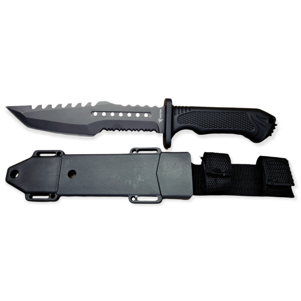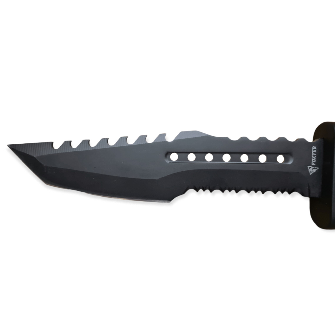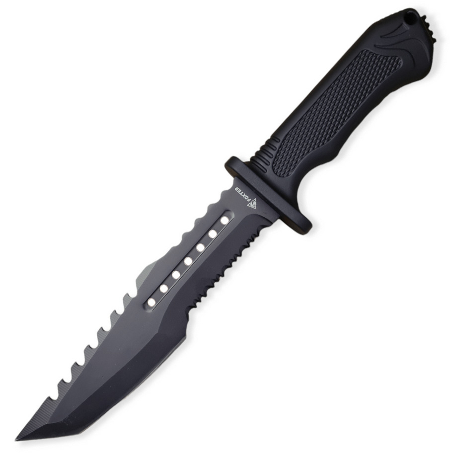 Nóż taktyczny o stałej głowni wykonany z trwałej stali nierdzewnej pokrytej czarną powłoką, która świetnie chroni przed korozją oraz niepożądanym odblaskiem.