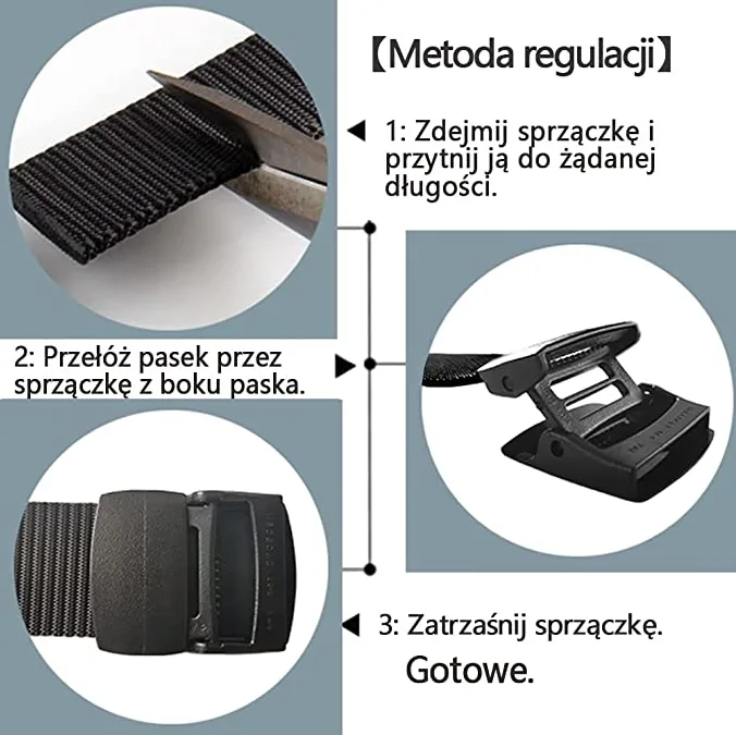 Mocny, nylonowy pas taktyczny z łatwą możliwością regulacji oraz metalową klamrą.