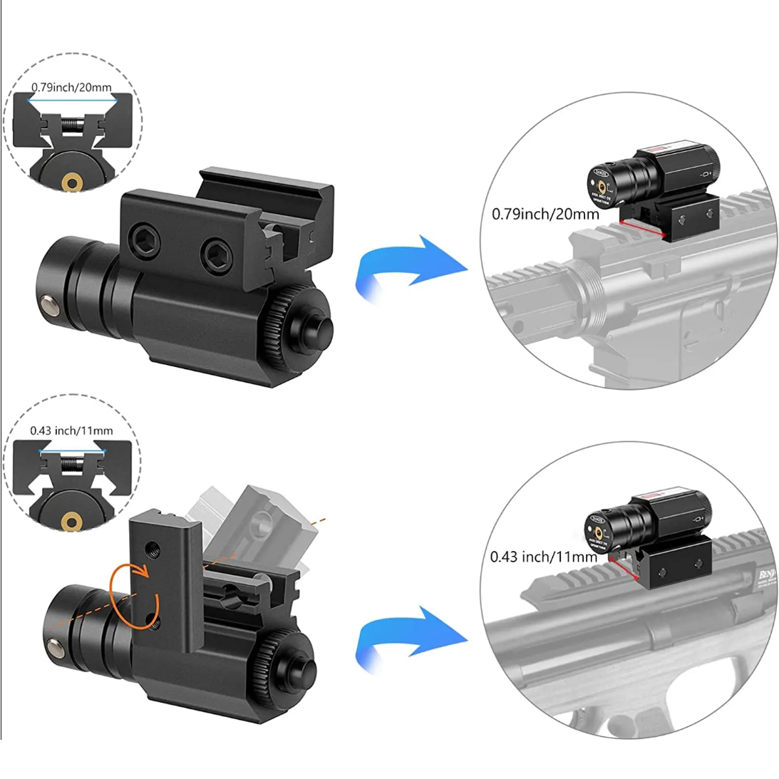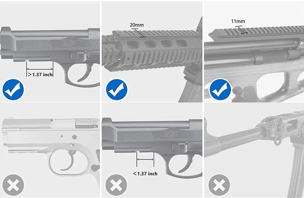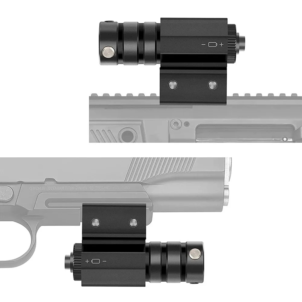 Montaż pasuje do standardowej szyny 11mm oraz 22mm i pozwala na zamocowanie urządzenia na każdym rodzaju broni pneumatycznej wyposażonej w szynę montażową.