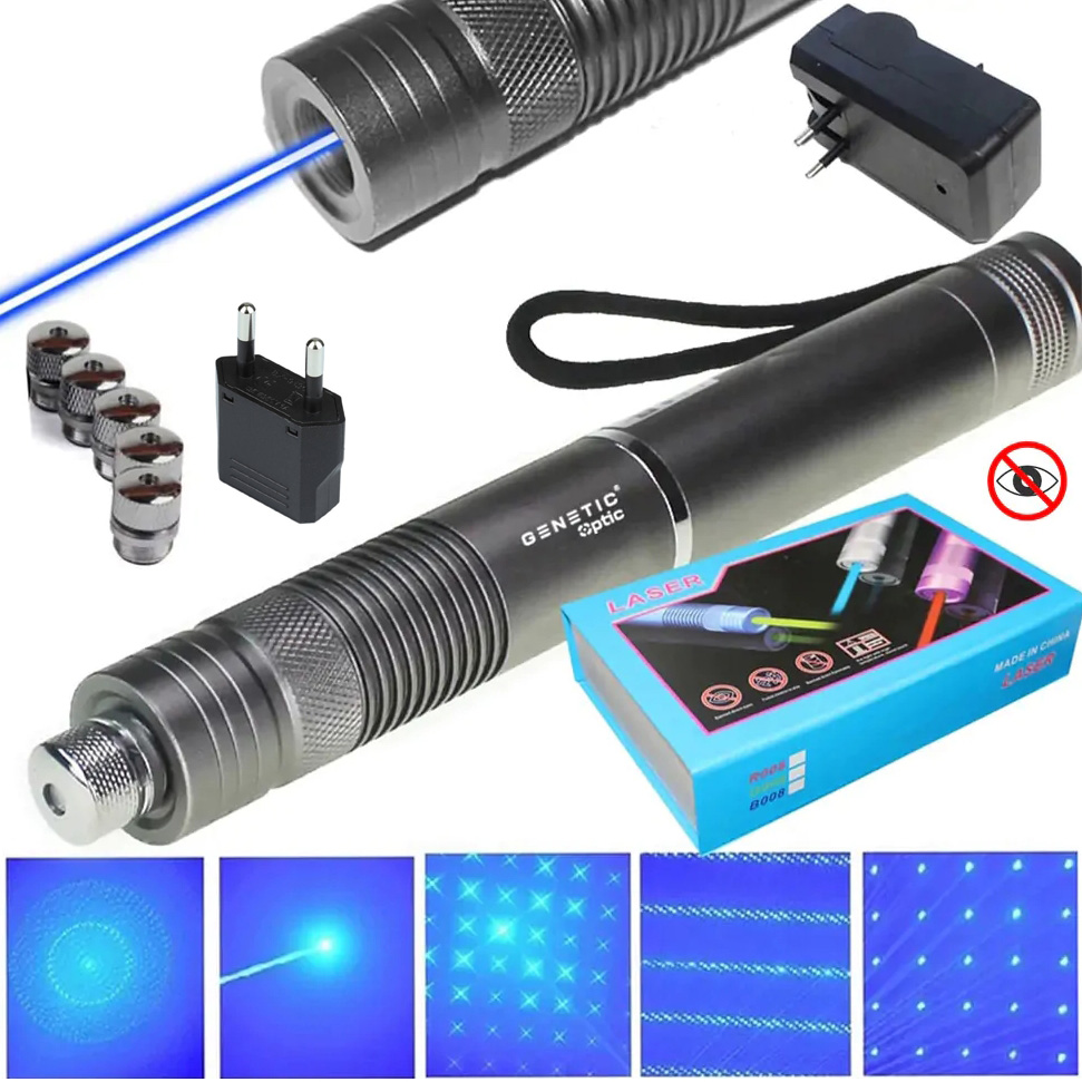 GENETIC® Laser wskaźnik laserowy mocny punktowy niebieski ładowarka nakładki zestaw