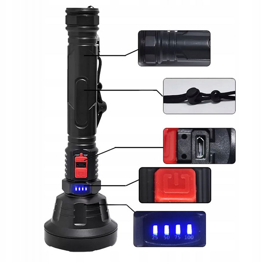 Mocna dioda LED o wysokiej skuteczności i energooszczędności zapewniają wysoką moc światła oraz długi czas na jednym ładowaniu.