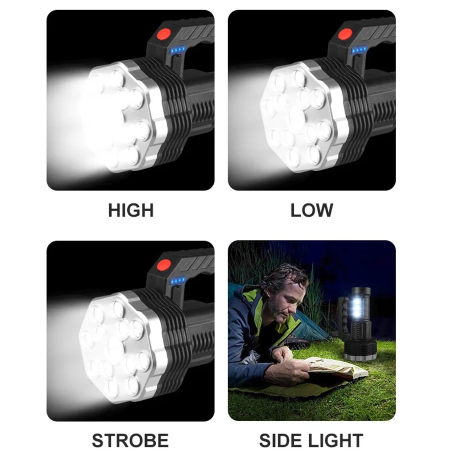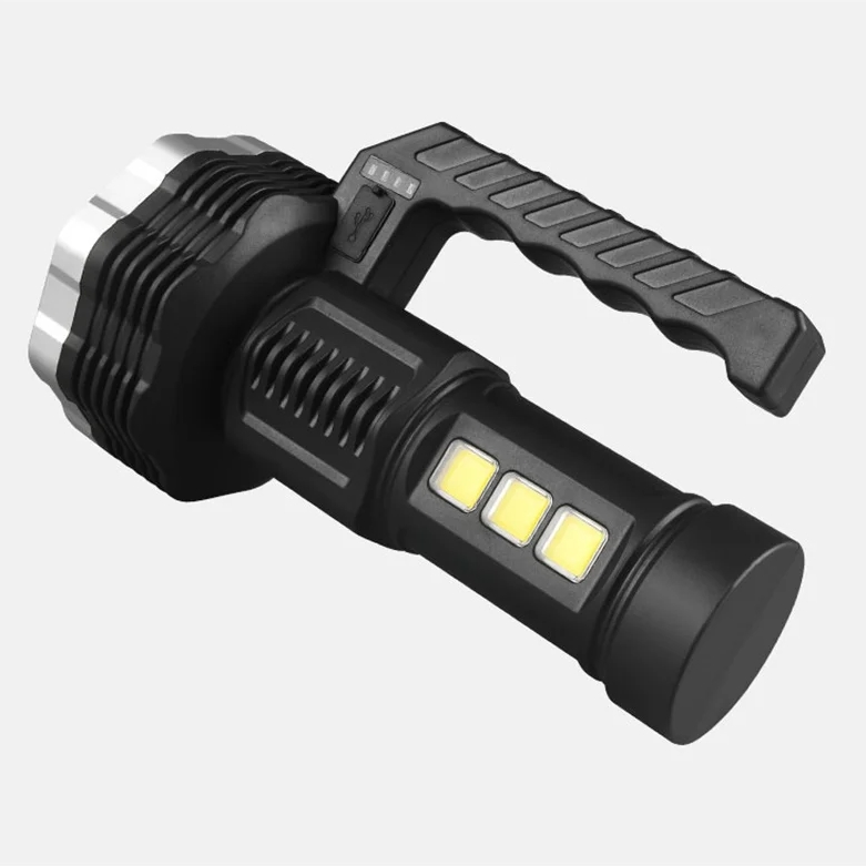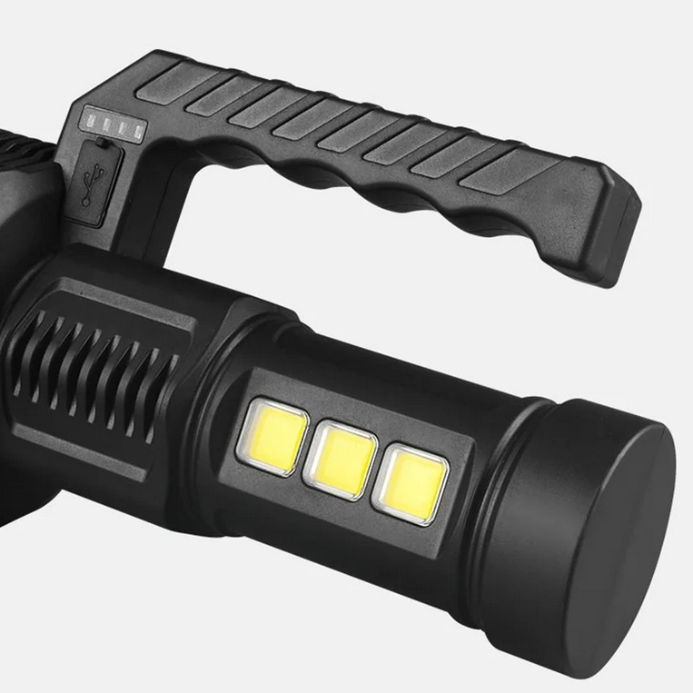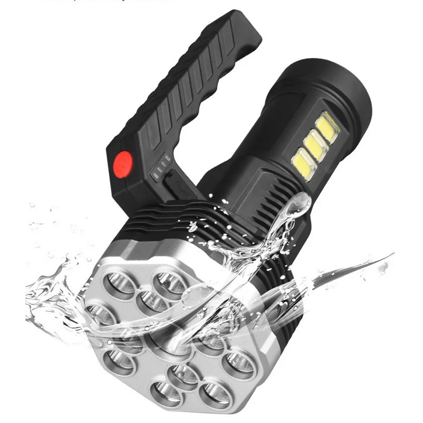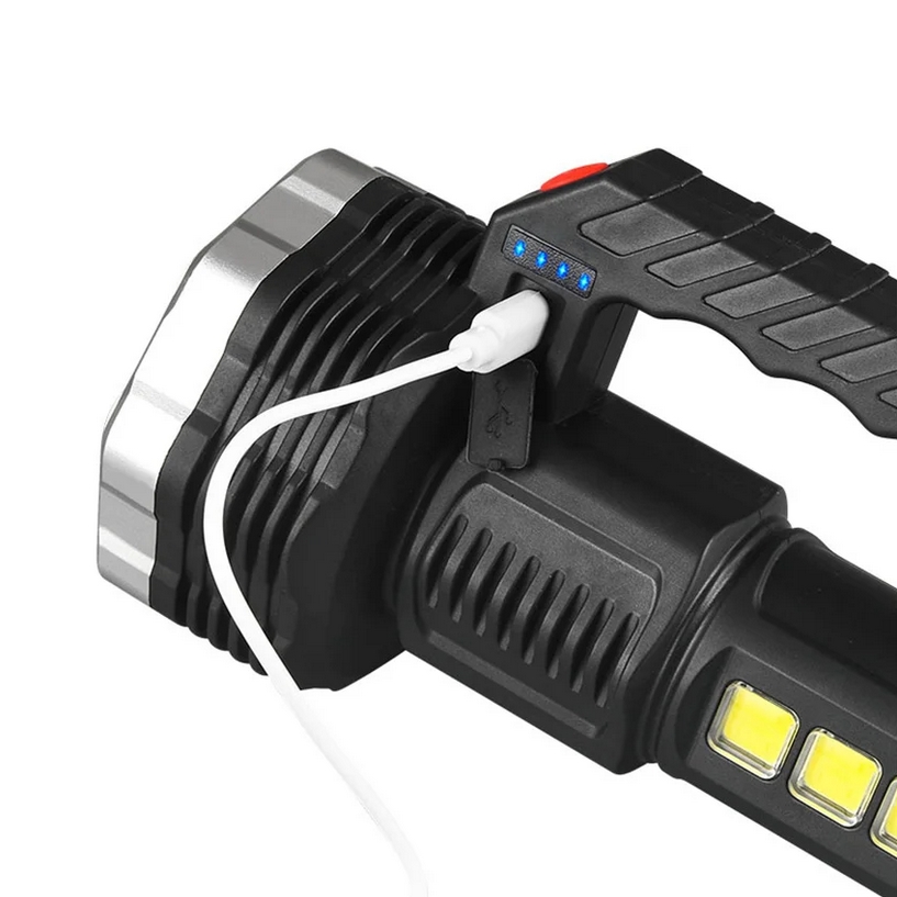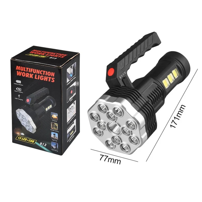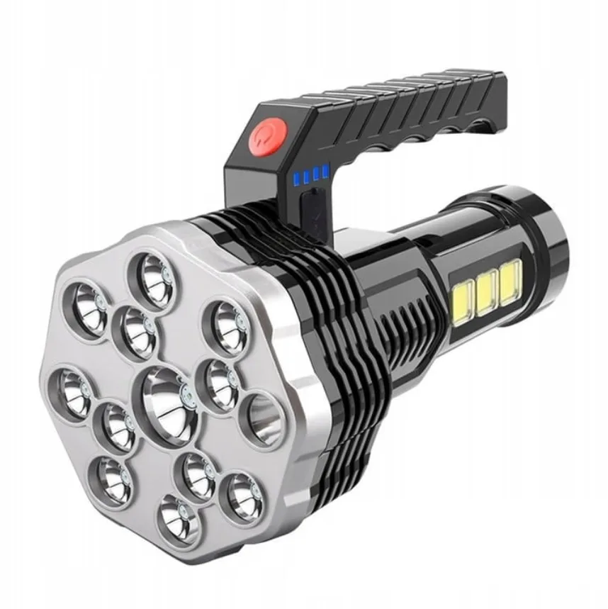 Bardzo mocna przenośna latarka akumulatorowa wyposażona w 13 diod led na przodzie oraz 3 diody cob na boku urządzenia.