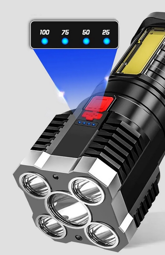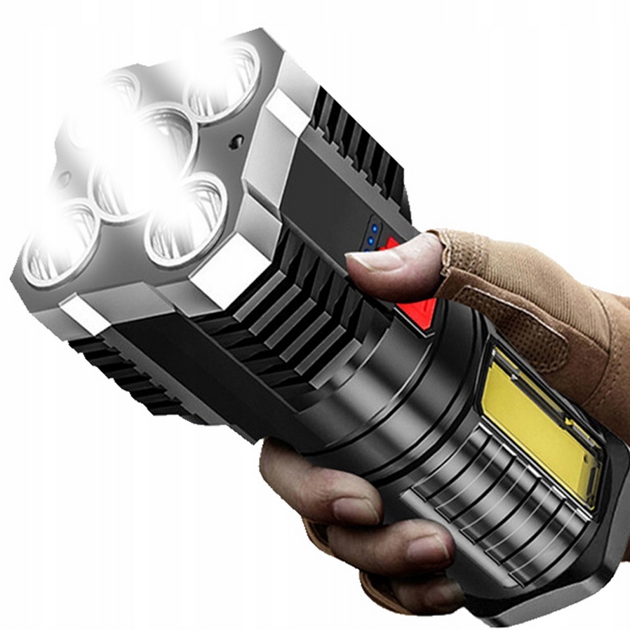 Latarka wyposażona w 5 diod led na przodzie oraz 1 diodę led na boku urządzenia.