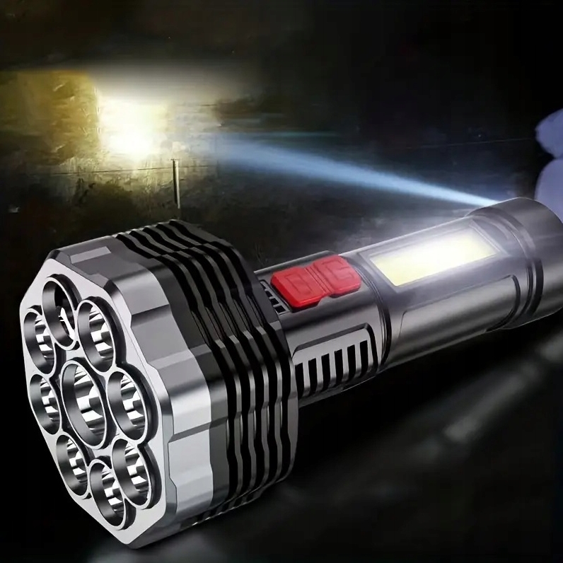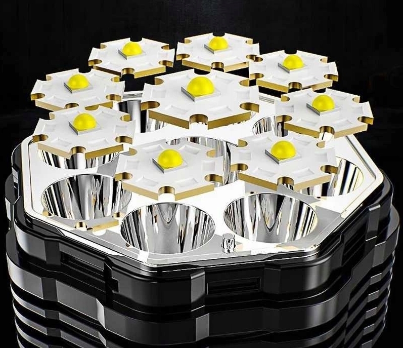 Latarka wyposażona w 9 diod led na przodzie oraz 1 diodę cob na boku urządzenia.