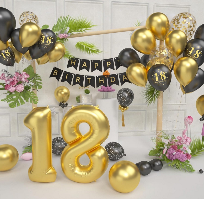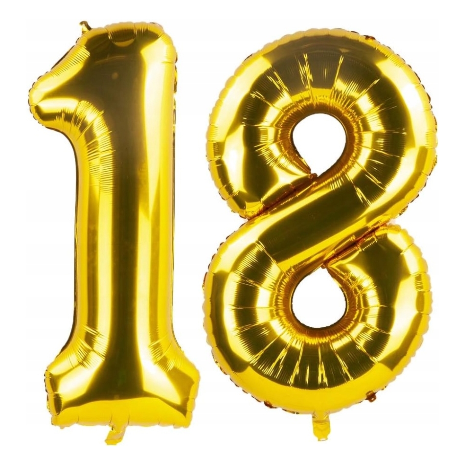 - Wielki balon w kształcie cyfry „1” – nadaje się idealnie do dekoracji przyjęć urodzinowych związanych z „osiemnastką” – 1 szt.