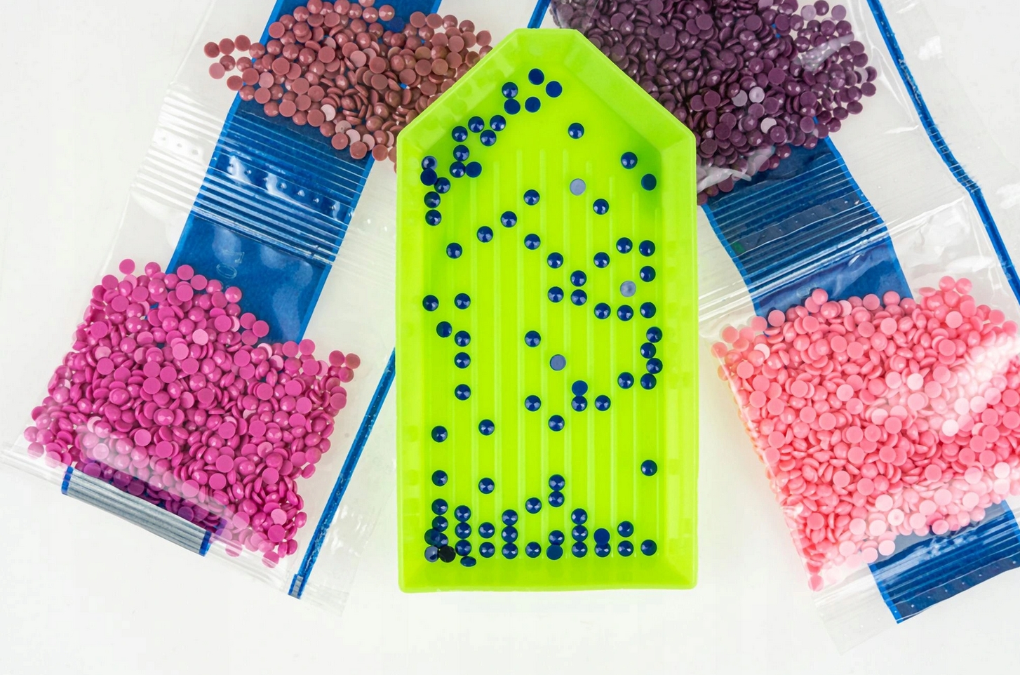 - diamenciki o różnych kolorach, które są posegregowane w ponumerowane i oznaczone odpowiednimi symbolami woreczki