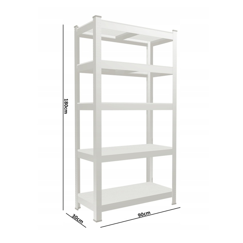 Regał składa się z 5 półek, na których można ułożyć produkty, kartony, czy też urządzenia.