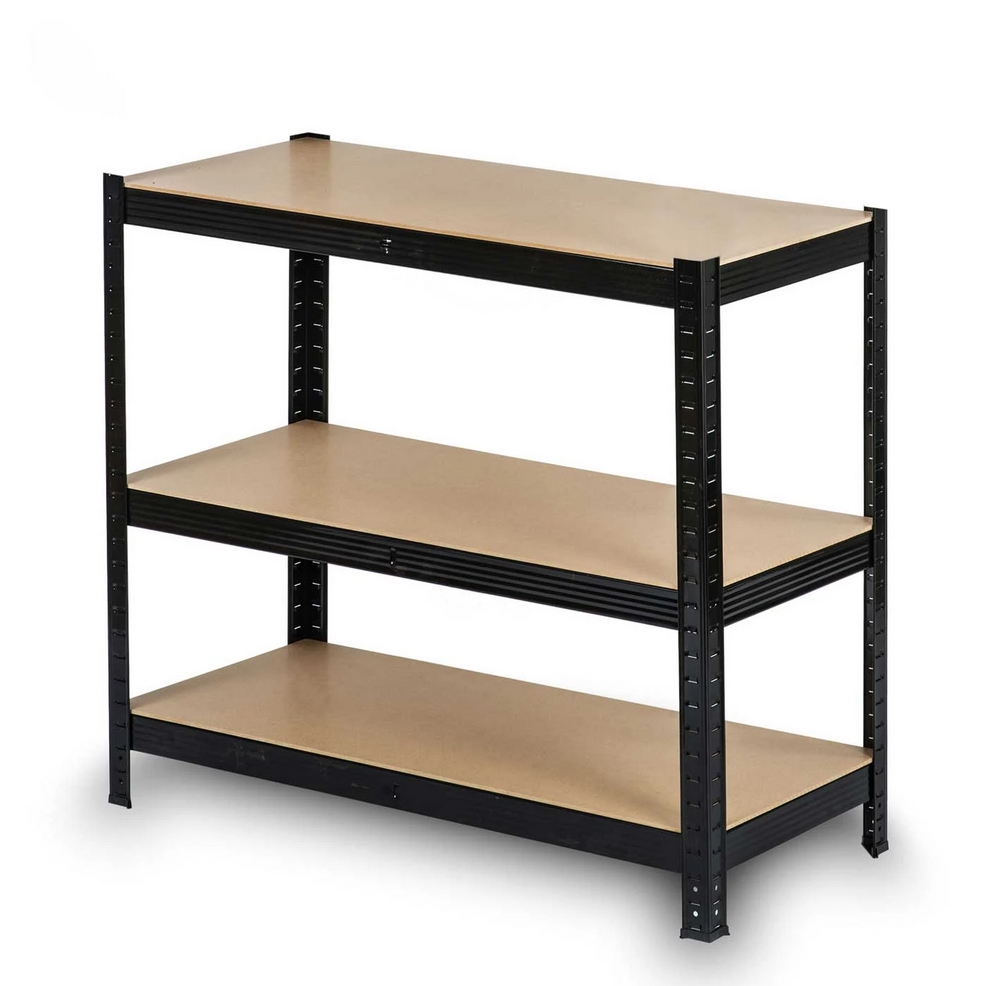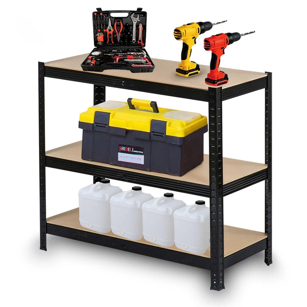 Funkcjonalny i stabilny regał magazynowy w kolorze czarnym, który znakomicie sprawdzi się w garażu, archiwum, sklepie, w schowku na narzędzia, piwnicy.