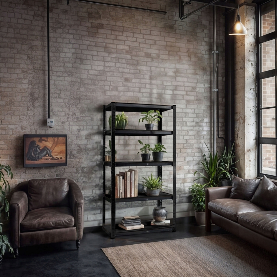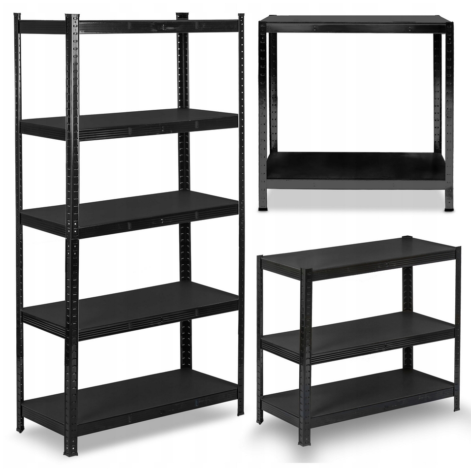 Funkcjonalny i stabilny regał magazynowy w kolorze czarnym, który znakomicie sprawdzi się w garażu, archiwum, sklepie, w schowku na narzędzia, piwnicy.