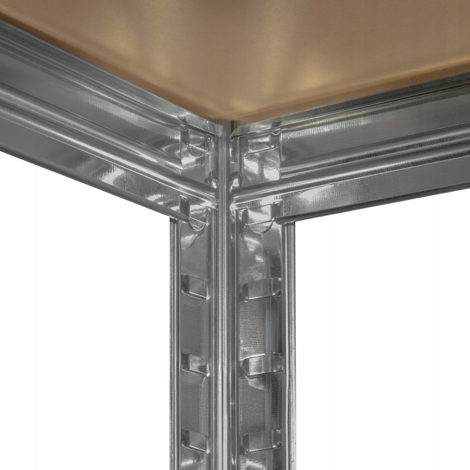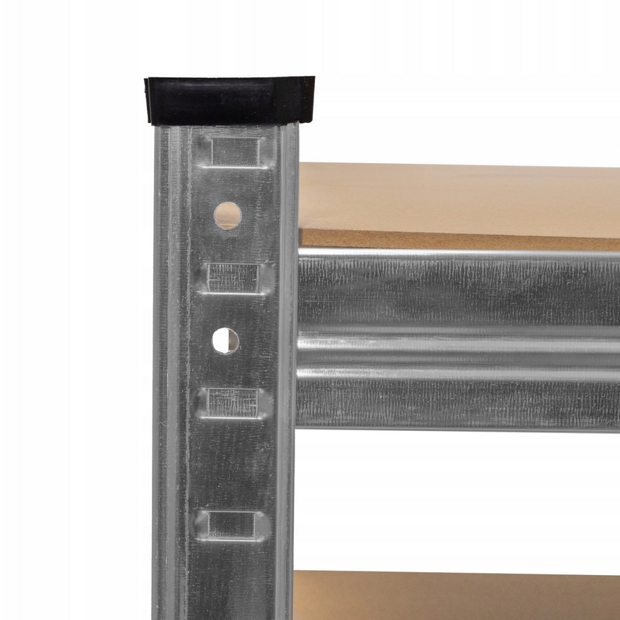Funkcjonalny i stabilny regał magazynowy w kolorze srebrnym, który znakomicie sprawdzi się w garażu, archiwum, sklepie, w schowku na narzędzia, piwnicy.