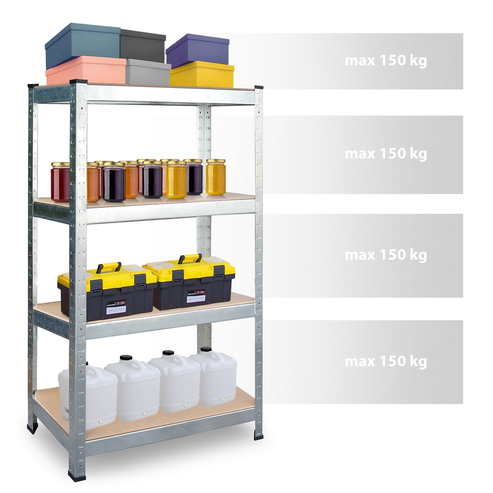 Regał składa się z 4 półek, na których można ułożyć produkty, kartony, czy też urządzenia maksymalnie obciążając każdą półkę aż do 150 kg co daje łączną ładowność aż 600kg.