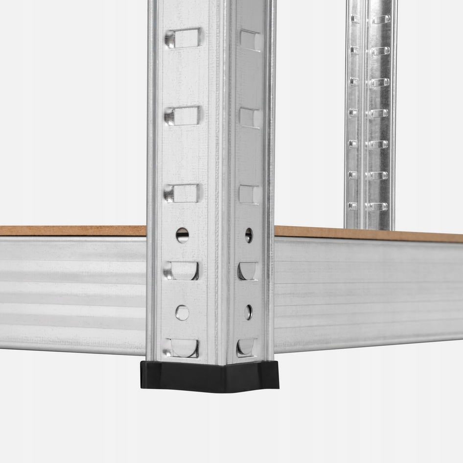 Funkcjonalny i stabilny regał magazynowy w kolorze srebrnym, który znakomicie sprawdzi się w garażu, archiwum, sklepie, w schowku na narzędzia, piwnicy.