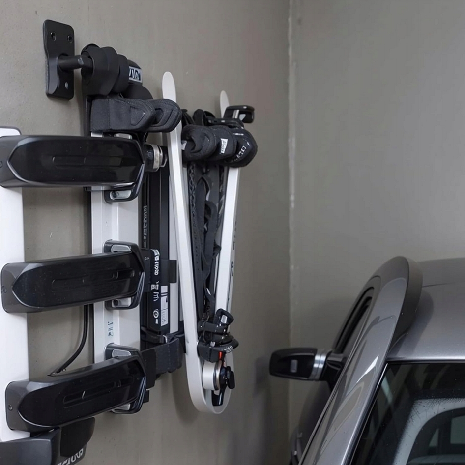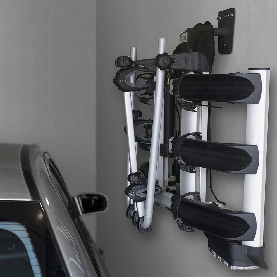 Wieszak ścienny przeznaczony do wygodnego przechowywania platform rowerowych i bagażników montowanych na haku holowniczym.