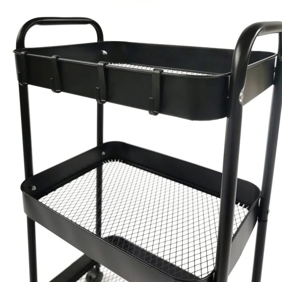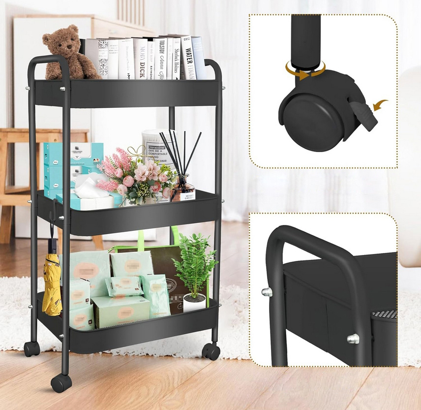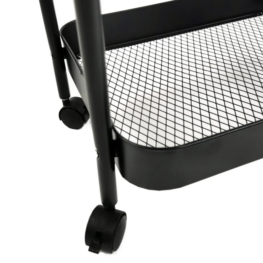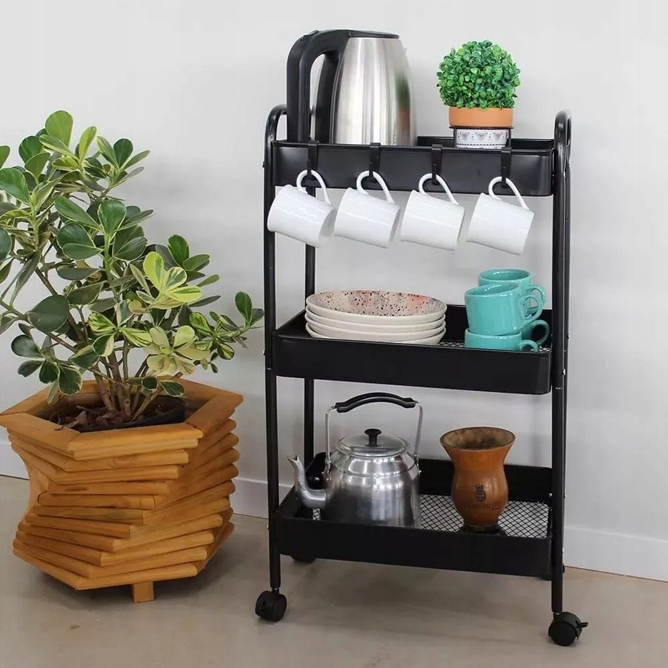Wielofunkcyjny wózek 3-poziomowy wykonany z trwałego metalu w eleganckim czarnym kolorze doskonale sprawdzi się w domu, biurze lub łazience.