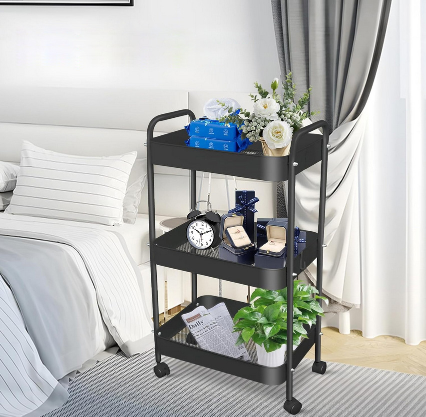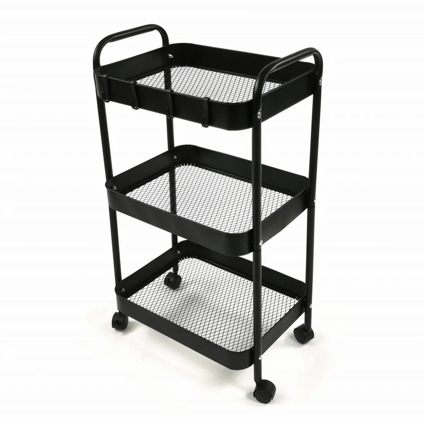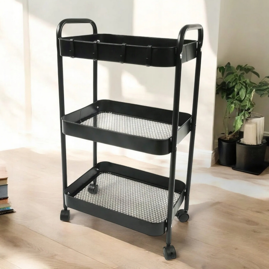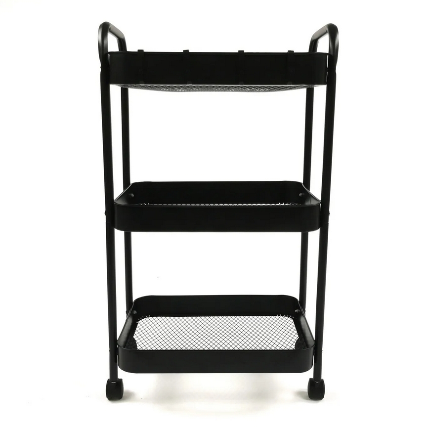 Wielofunkcyjny wózek 3-poziomowy wykonany z trwałego metalu w eleganckim czarnym kolorze doskonale sprawdzi się w domu, biurze lub łazience.