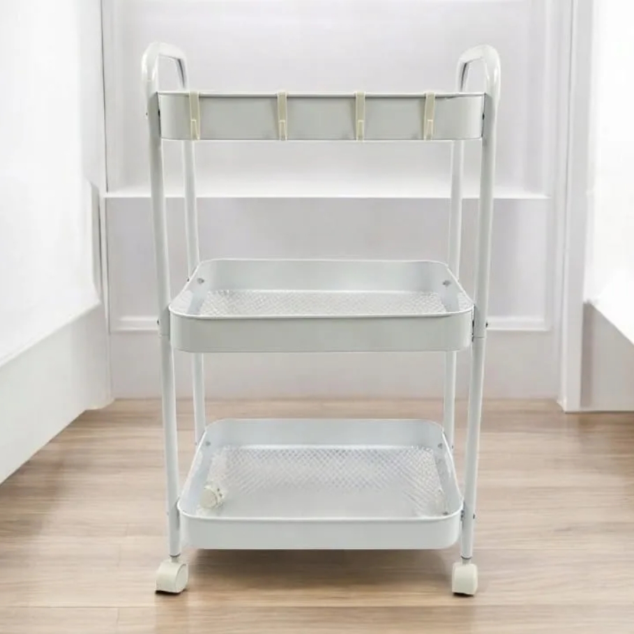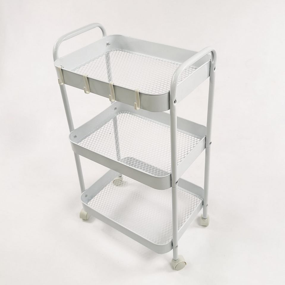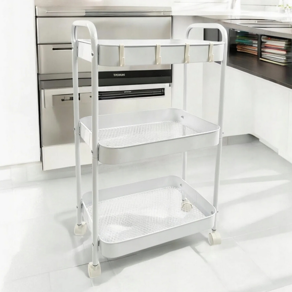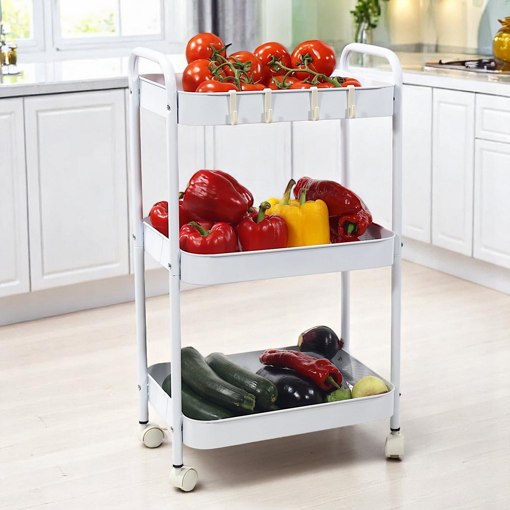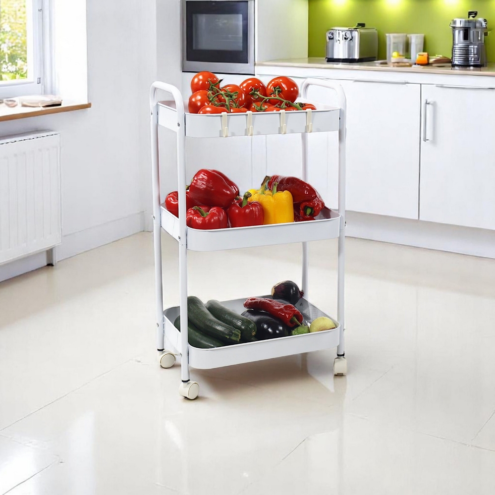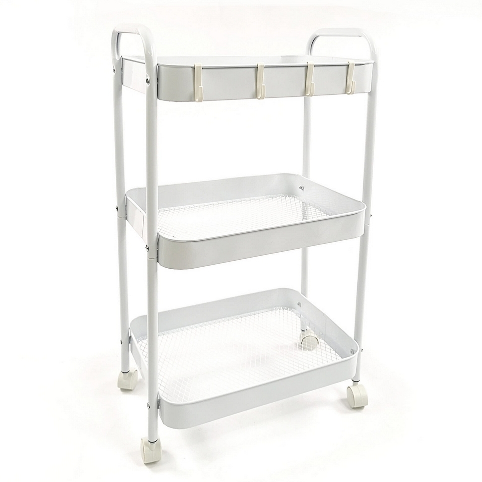 Wielofunkcyjny wózek 3-poziomowy wykonany z trwałego metalu w eleganckim białym kolorze doskonale sprawdzi się w domu, biurze lub łazience.