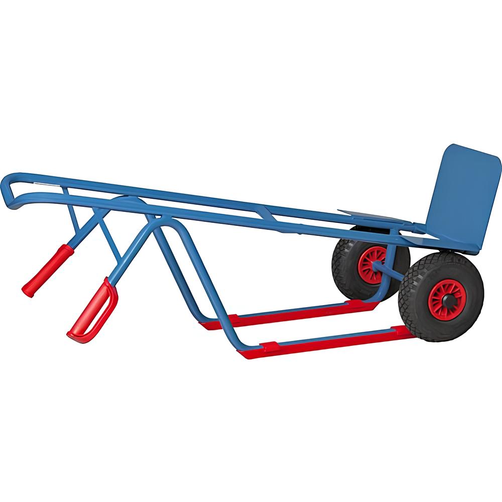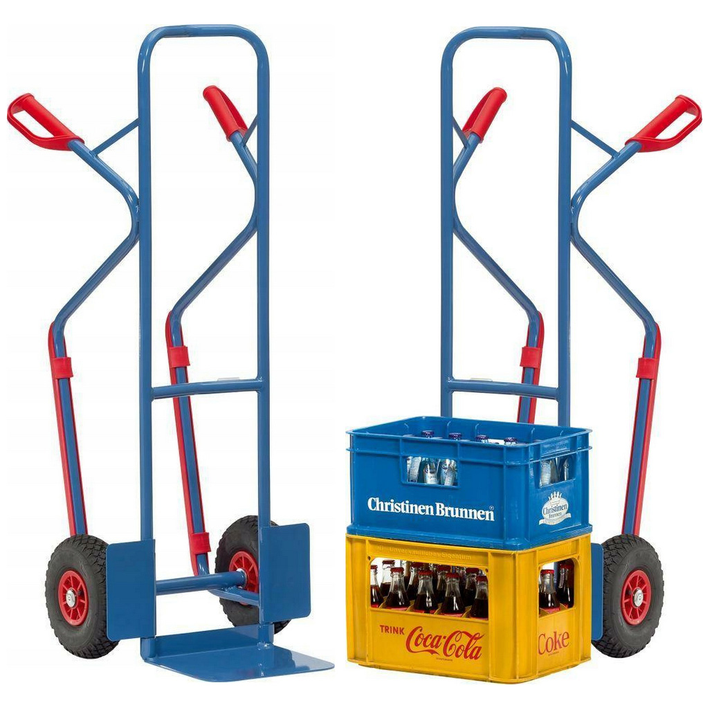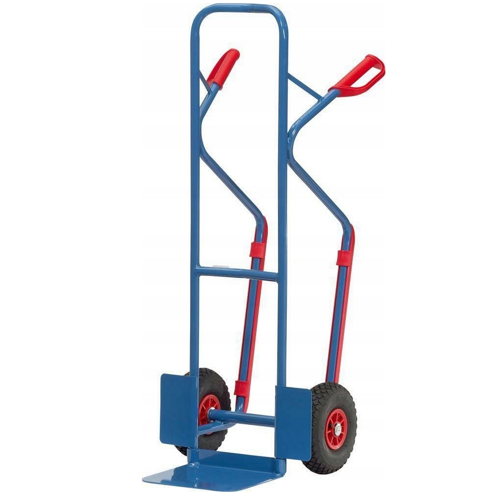 Wózek wyposażony jest w pompowane koła z gumy, które zapewniają łatwość manewrowania i stabilność na każdej powierzchni, w tym na schodach.