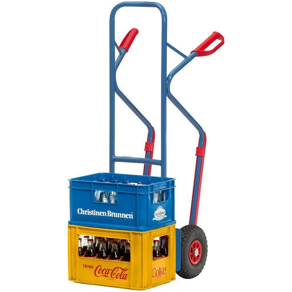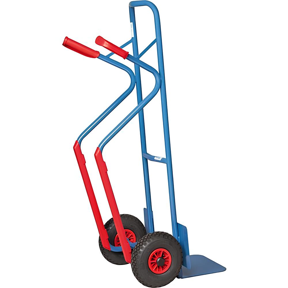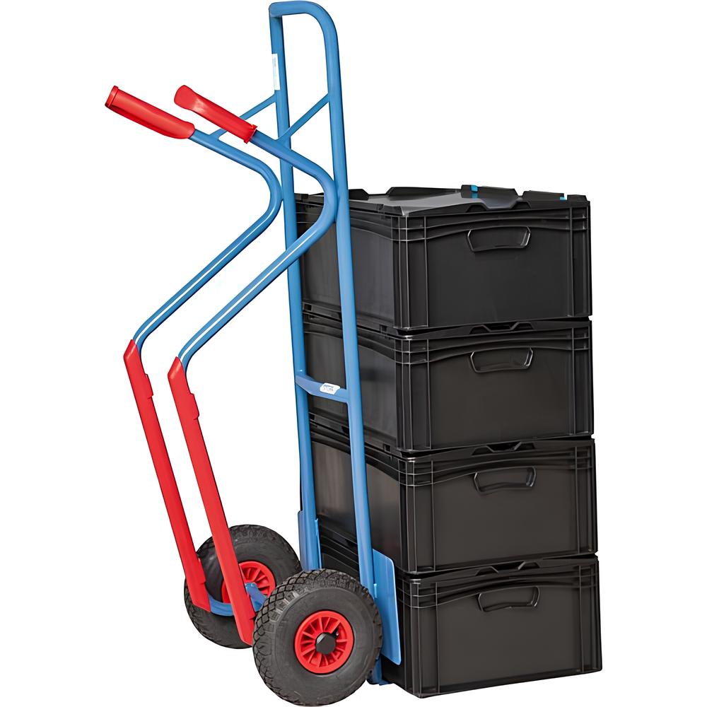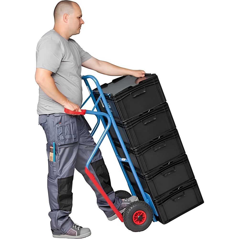 Wózek wyposażony jest w pompowane koła z gumy, które zapewniają łatwość manewrowania i stabilność na każdej powierzchni, w tym na schodach.