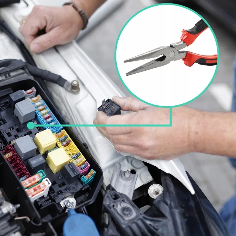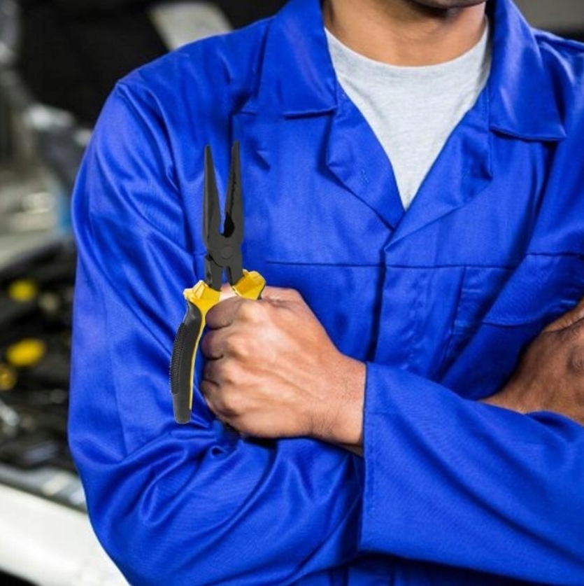 - Szczypce wydłużone proste – umożliwiają precyzyjne manewry w trudno dostępnych miejscach. Pozwalają na wyjmowanie m.in. gwoździ czy kołków, precyzyjne formowanie drutu. Ząbkowane szczęki gwarantują pewny chwyt a dodatkowy otwór u ich podstawy pozwala odkręcać śruby, nakrętki itp.