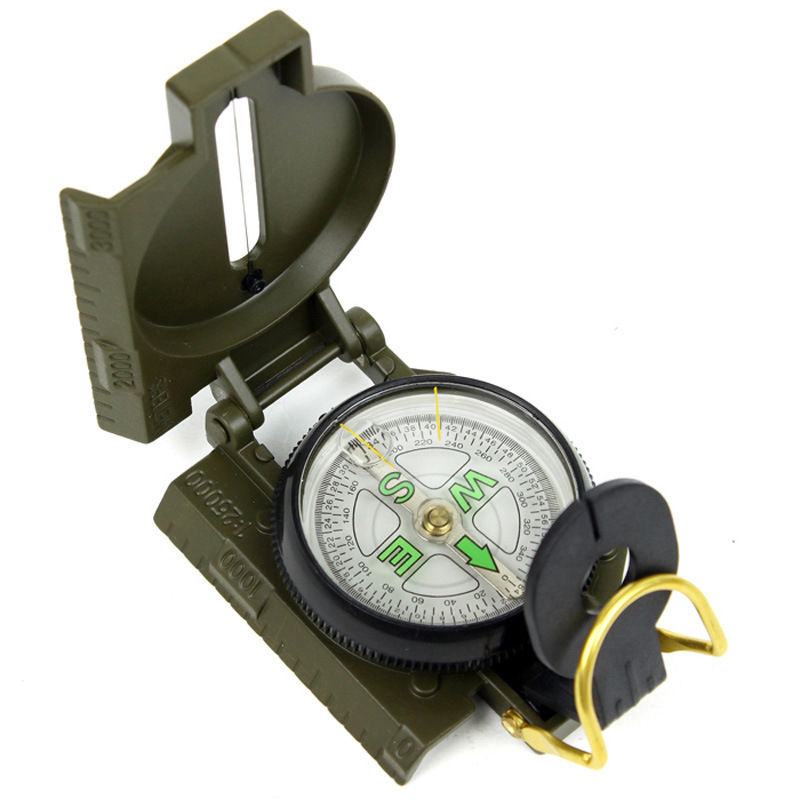 Profesjonalny wojskowy kompas pryzmatyczny w metalowej obudowie, solidnie wykonany, doskonały do wykreślania pozycji na mapach terenowych i żeglarskich.