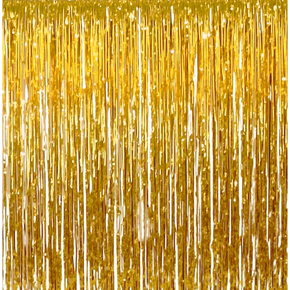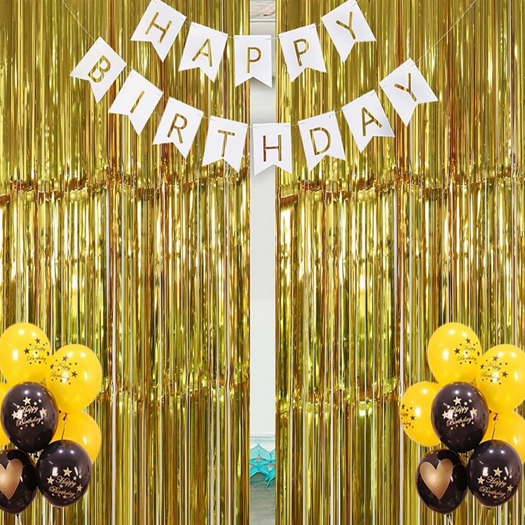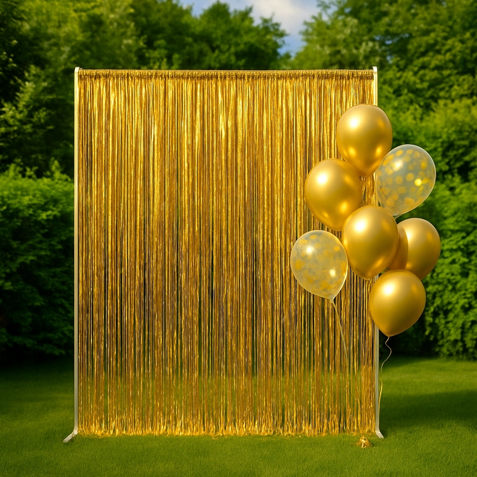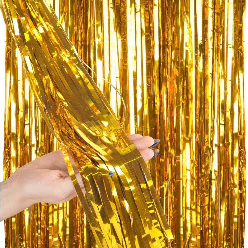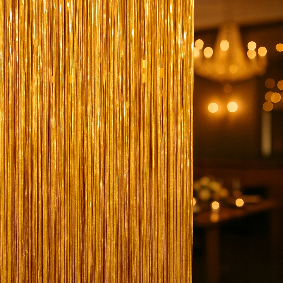 Kurtyna w modnym kolorze złotym pozwoli ślicznie ozdobić wnętrze na przyjęcie urodzinowe lub dowolną imprezę.