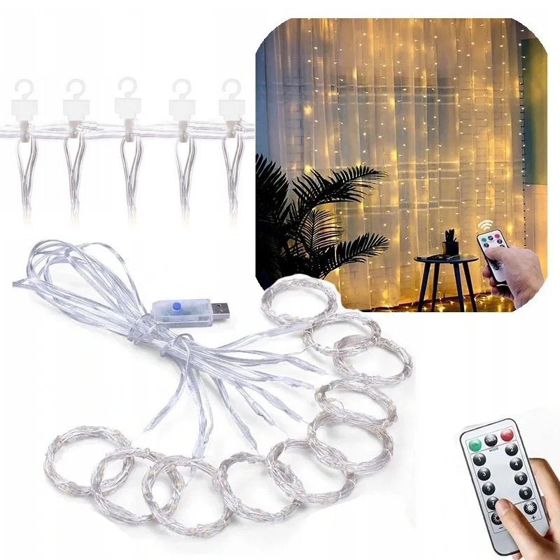 Kurtyna świetlna led drucik usb lampki sople pilot usb biały ciepły 2x2m + haczyki