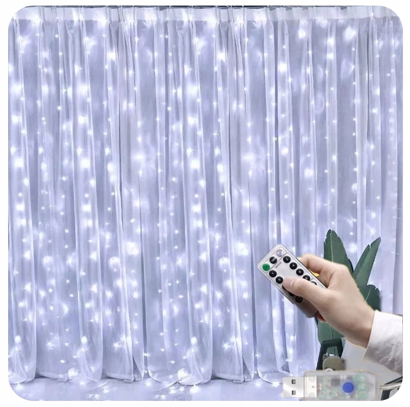 Kurtyna świetlna led drucik usb lampki sople pilot usb biały zimny 2x2m + haczyki