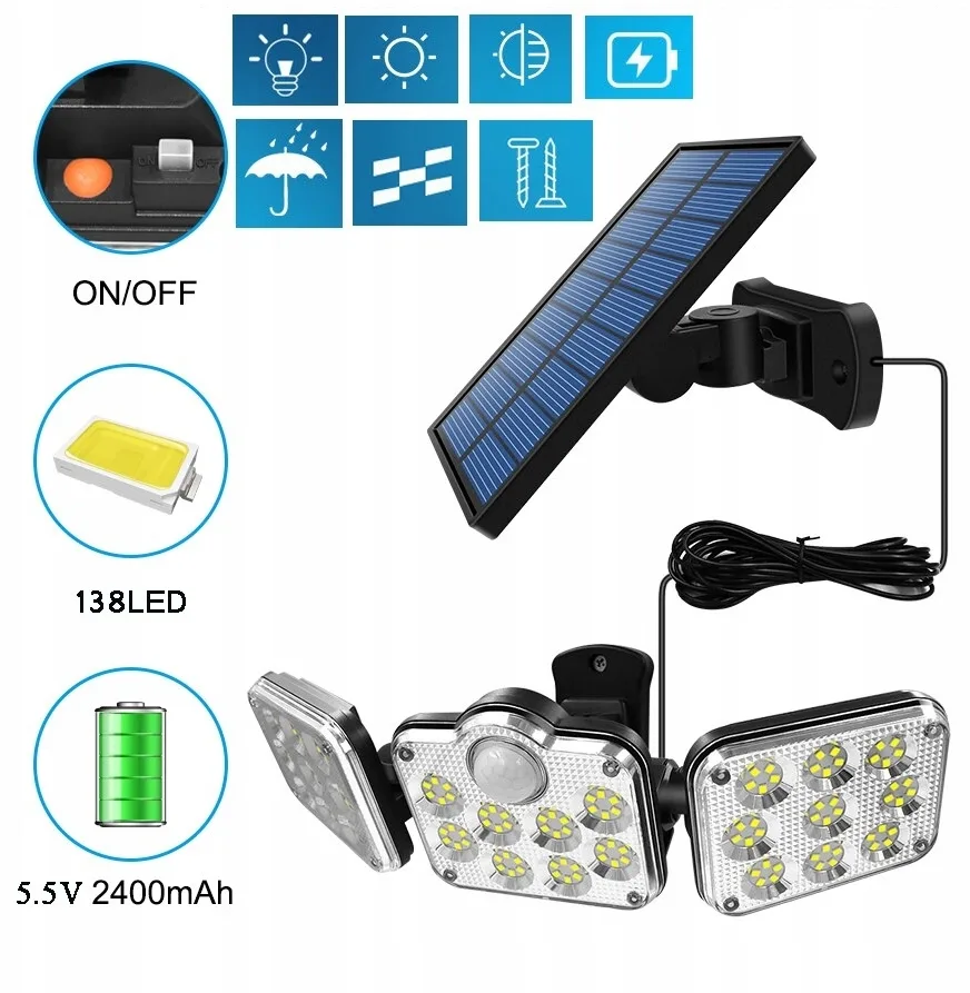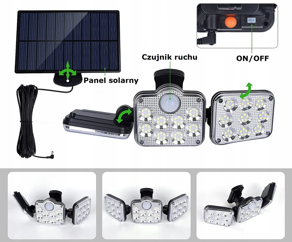Lampa solarna led została wyposażona w aż trzy reflektory, które można ustawić w dowolnej pozycji tak, by dokładnie doświetlić wszystkie zakamarki na posesji.