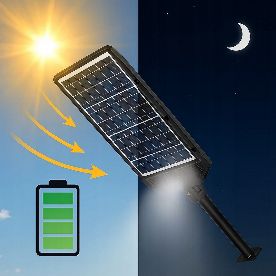 Lampa led wyposażona jest w panel solarny, który automatycznie ładuje urządzenie w dzień, by zapewnić mu źródło energii na wieczór i noc.