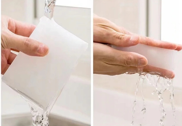 Gąbka skutecznie usuwa zabrudzenia bez użycia detergentów.