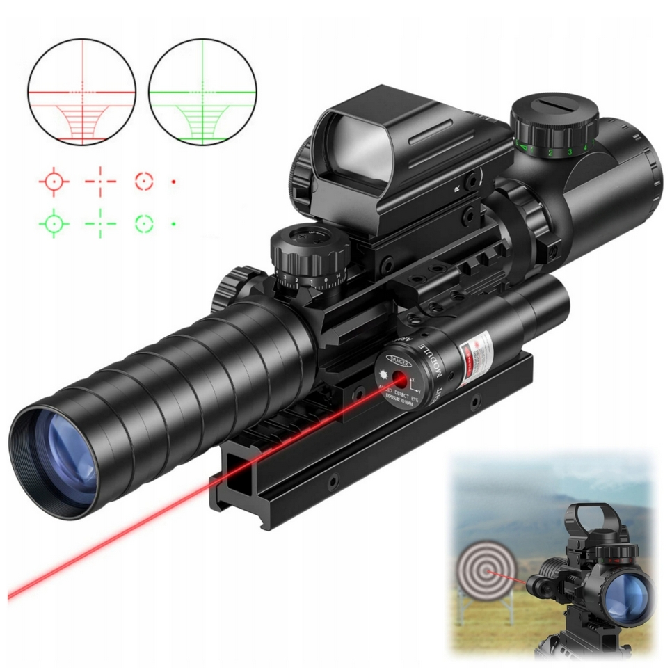 Zaawansowany zestaw optyczny 3w1 3-9×32 to wszechstronne rozwiązanie łączące lunetę celowniczą, kolimator (Red/Green Dot) oraz wskaźnik laserowy w jednej, solidnej konstrukcji.