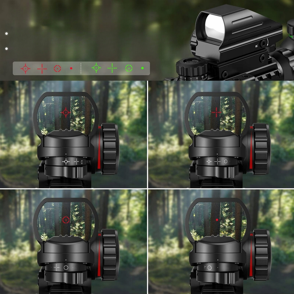 Kolimator oferuje 4 wzory siatki, a czerwony laser klasy IIIA (≤ 5 mW) wspomaga szybkie namierzanie celu.