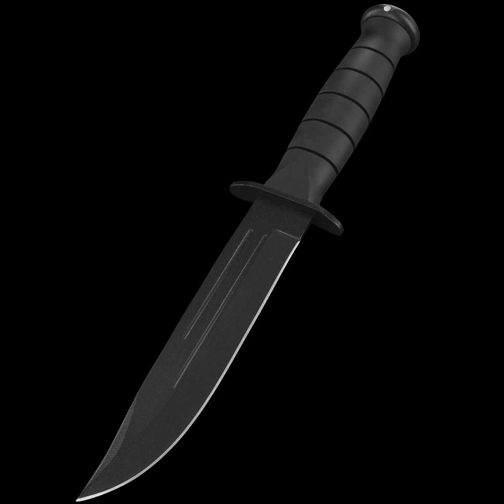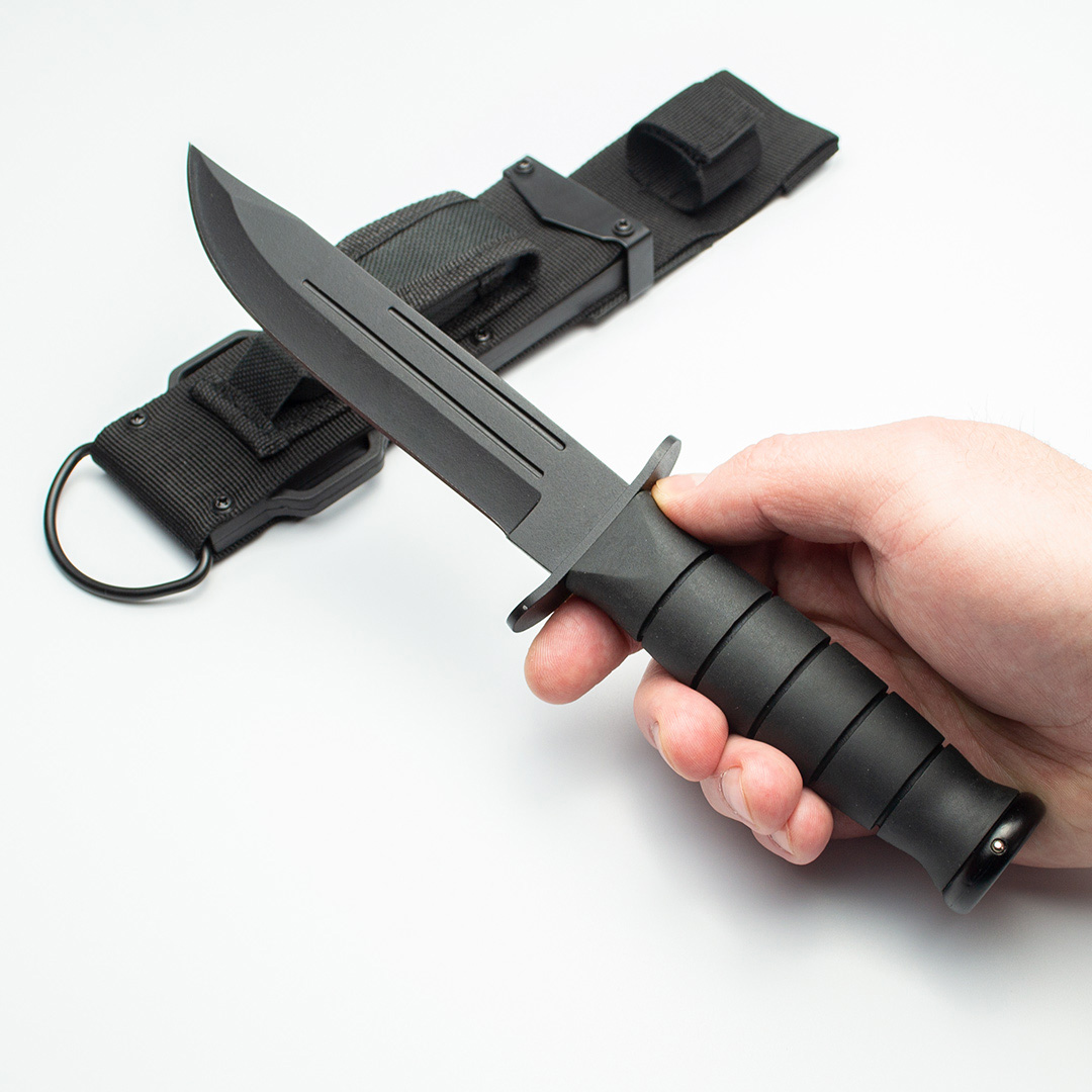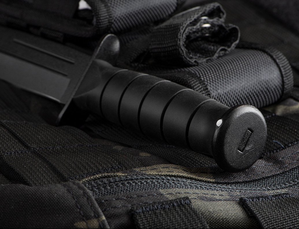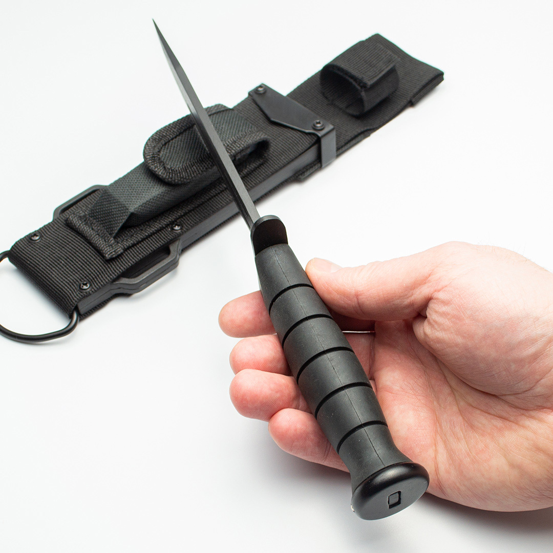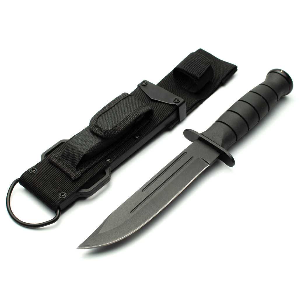 Nóż wojskowy o stałej głowni, wykonany z wysokojakościowej stali nierdzewnej oraz tworzywa.