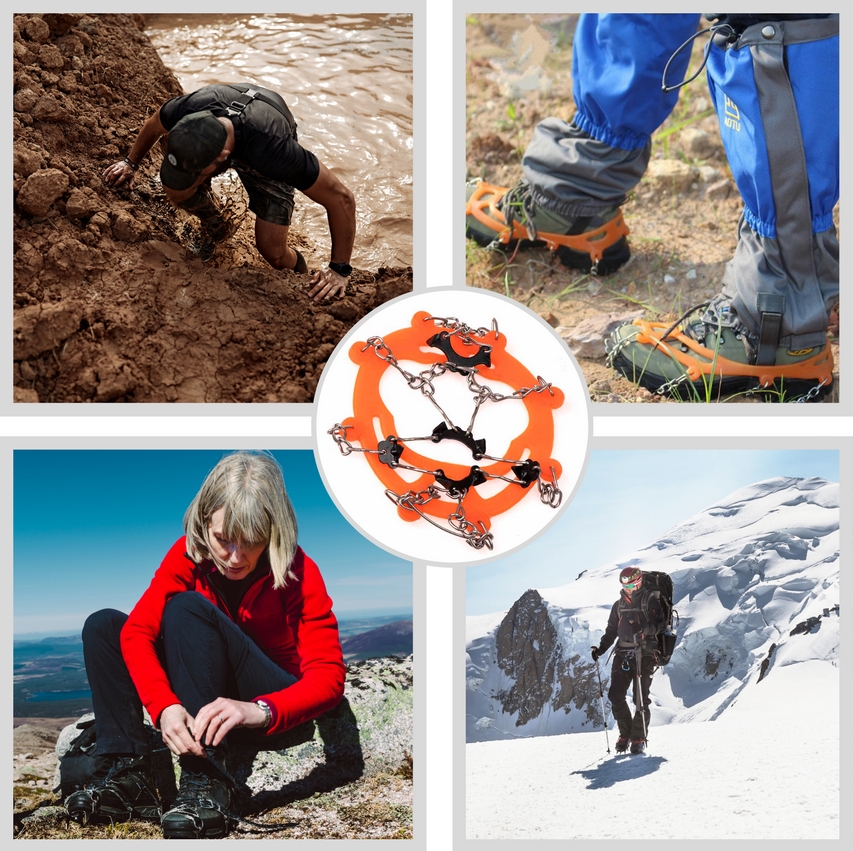 Elastyczne gumowe nakładki na buty z rakami do poruszania się w ciężkim terenie.