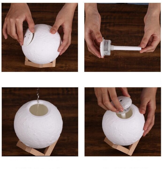 Ultradźwiękowy nawilżacz powietrza w kształcie księżyca w pełni wykorzystuje wysoką częstotliwość drgań do wytwarzania mgiełki wodnej, która za pomocą wentylatora wydmuchiwana jest na zewnątrz.