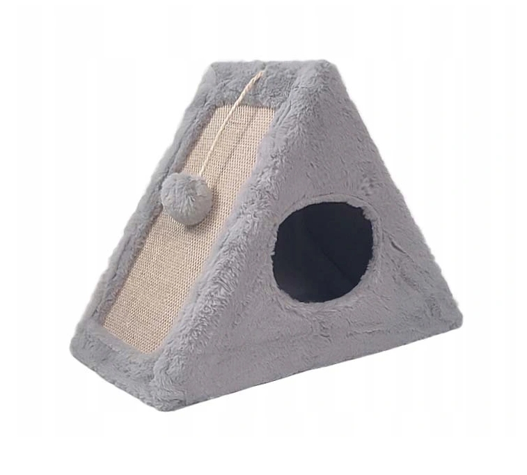 Domek dla kota obszyty mięciutkim materiałem z wbudowanym drapakiem łączący w sobie kilka funkcji.