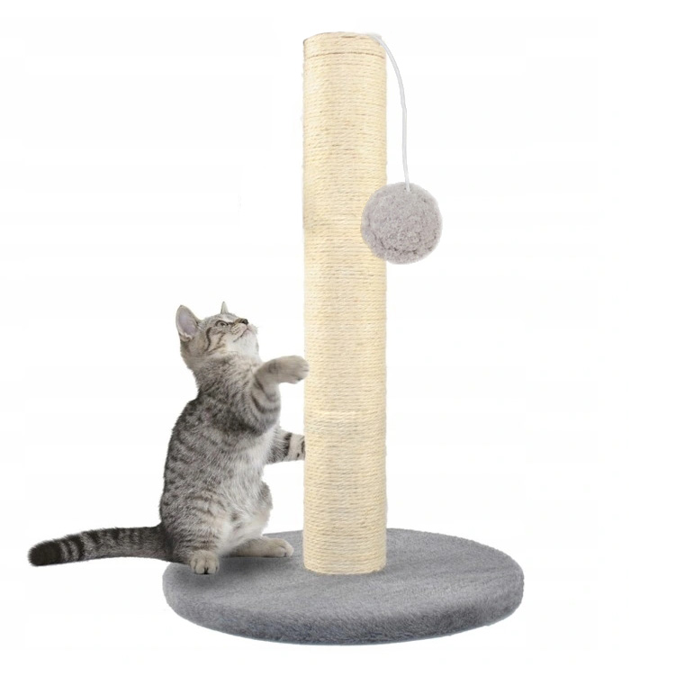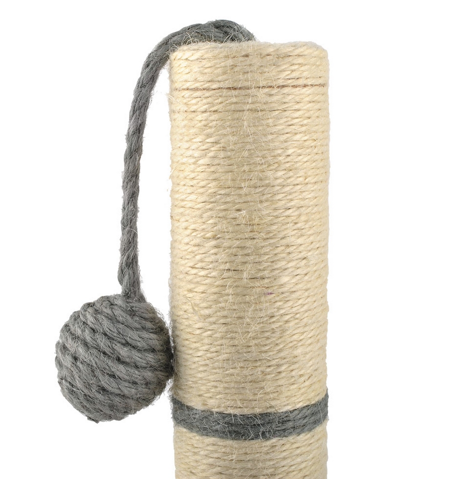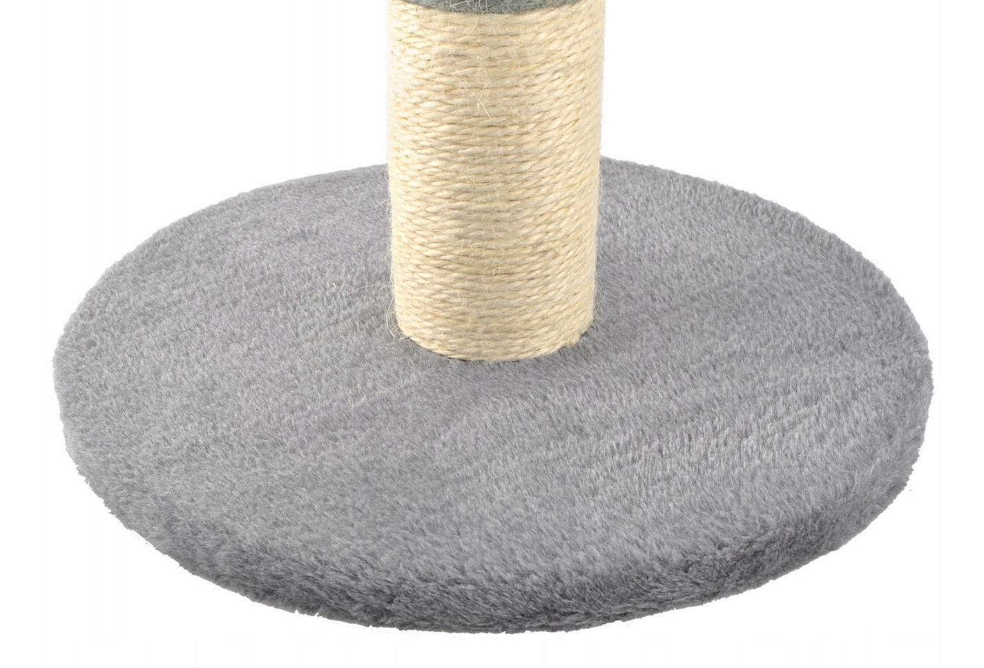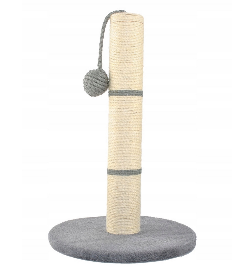 Drapak dla kota w kształcie słupka wykonany z linki sizalowej pochodzenia roślinnego, całość dopełnia podstawa obita miękkim futerkiem.