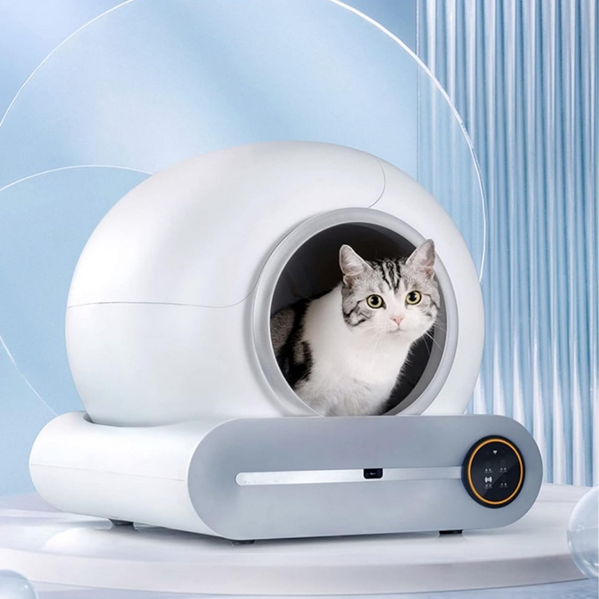 Inteligentna kuweta przeznaczona dla kotów wyposażona w funkcję automatycznego czyszczenia.