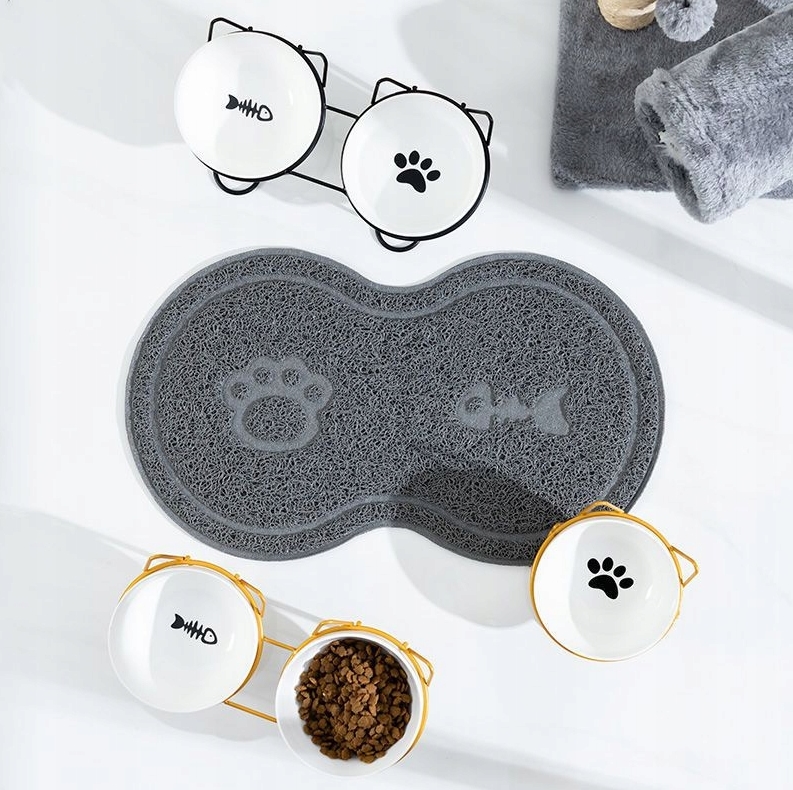 Wymiary maty pod miski dla psa i kota są idealne na umieszczenie na niej dwóch miseczek.
