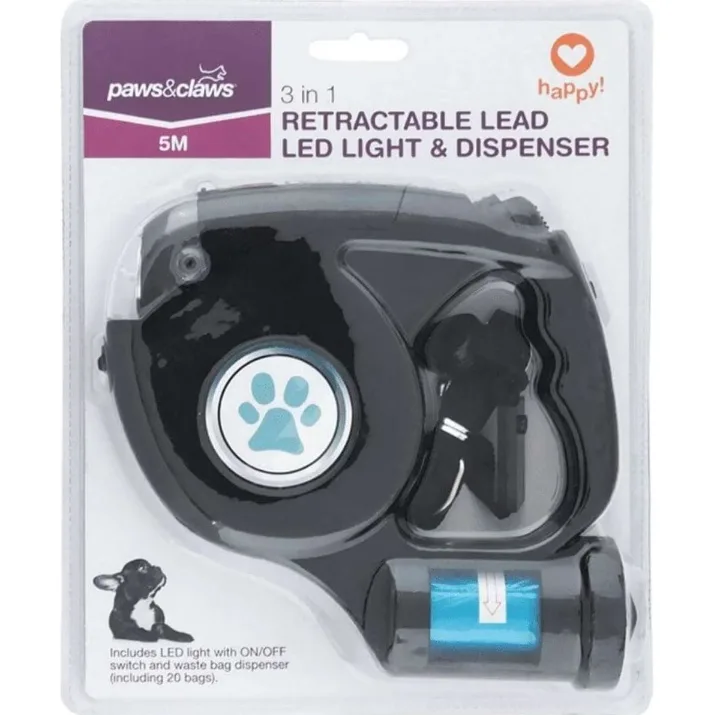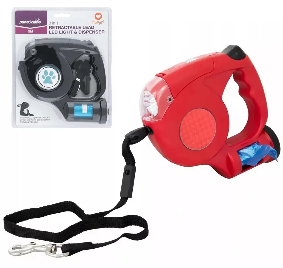 Smycz automatyczna łączy elementy smyczy flexi z latarką i zasobnikiem na woreczki na psie odchody.