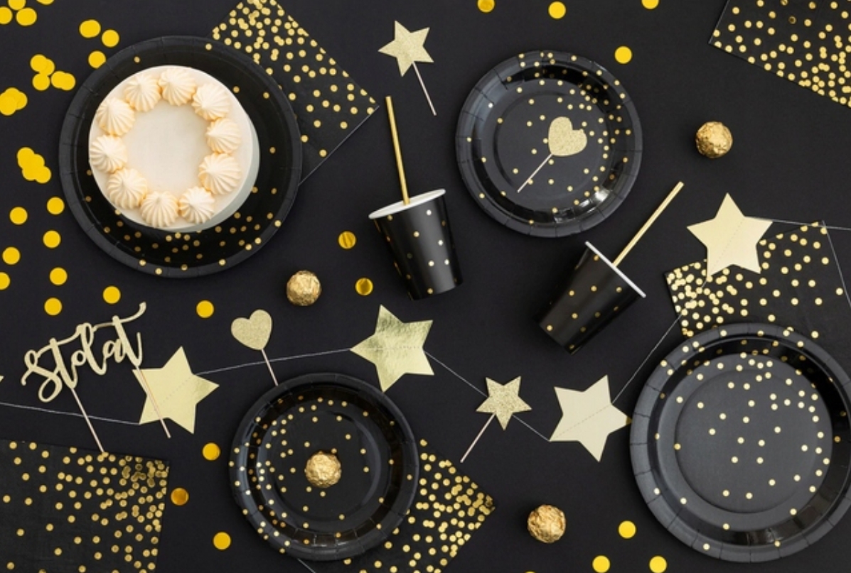 Połączenie eleganckiej czerni z motywem złotego konfetti nadaje aranżacji stołu nowoczesny i efektowny wygląd.