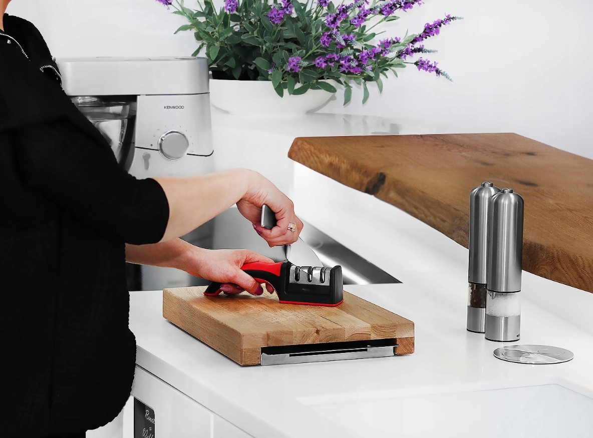 Ostrzałka nie zajmuje wiele miejsca, można schować ją w każdej szufladzie czy szafce kuchennej.
