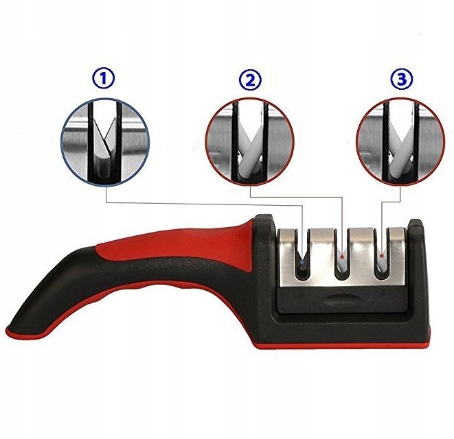 Ręczna ostrzałka do noży to 3 gniazda, które posiadają różne funkcje ostrzące.