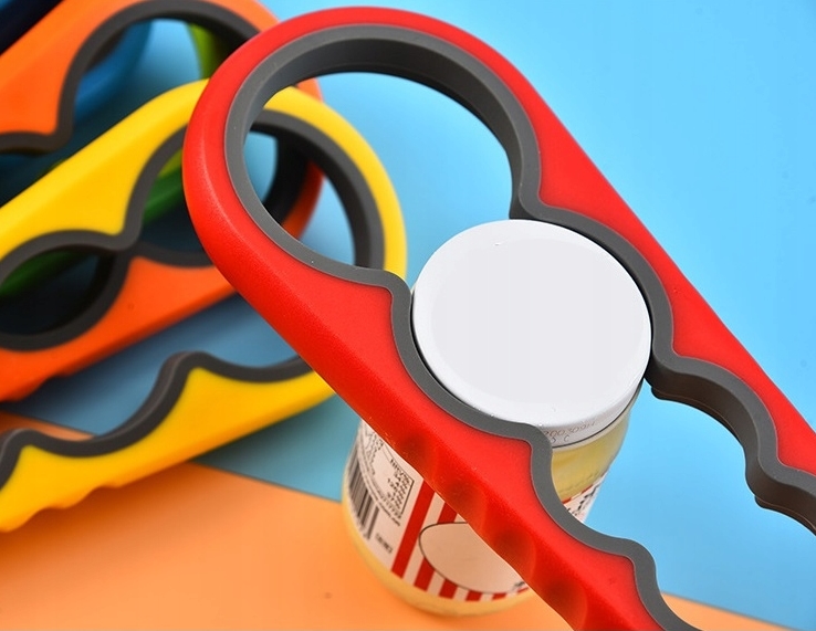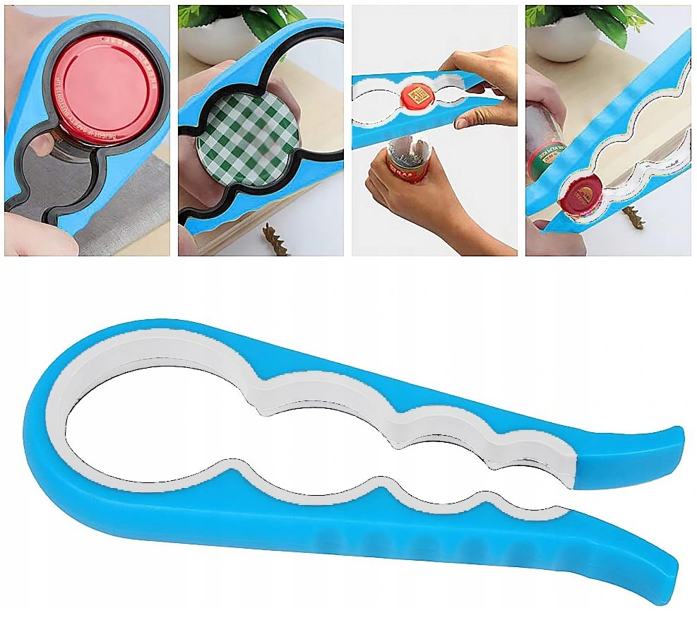 Uniwersalny otwieracz do słoików oraz butelek, otwieracz posiada aż 4 otwory o różnych rozmiarach, dzięki niemu otworzysz praktycznie każdą butelkę oraz słoik bez potrzeby używania siły.